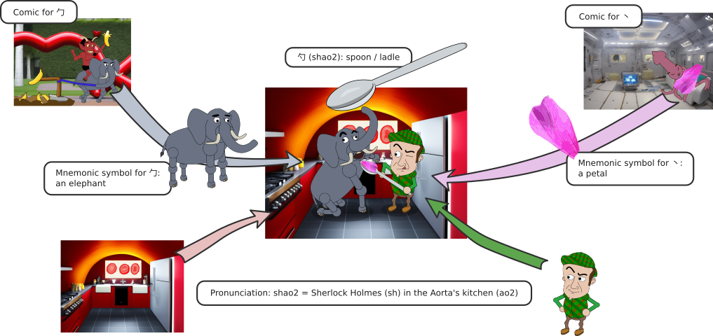The challenge: The character "勺" is proncounced "shao2" and is translated as "spoon" or "ladle". It's made up of the characters "勹" and "丶". That's a lot of information to remember!